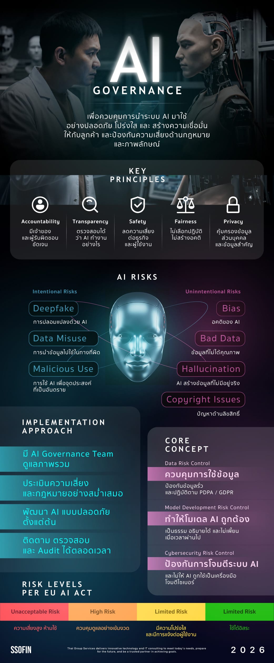 AI Governance คือแนวทางในการควบคุมการนำระบบ AI มาใช้งานเพื่อให้เกิดความปลอดภัย โปร่งใส สร้างความเชื่อมั่นให้กับลูกค้า และลดความเสี่ยงด้านกฎหมายและภาพลักษณ์ขององค์กร